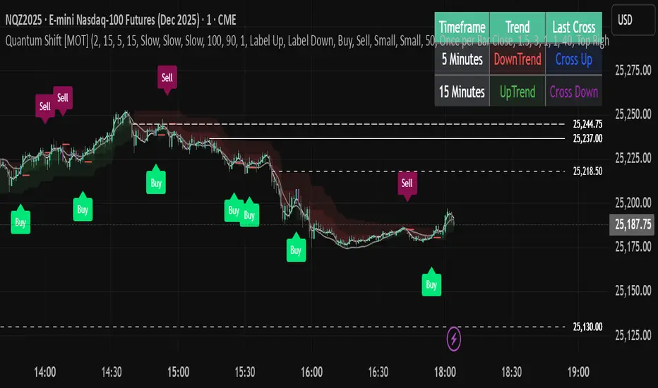Quantum Shift [MOT] is a multi-timeframe trading system designed to help traders identify high-probability reversal zones, breakout continuations, and trend shifts using a combination of real-time signal detection and structural level plotting.