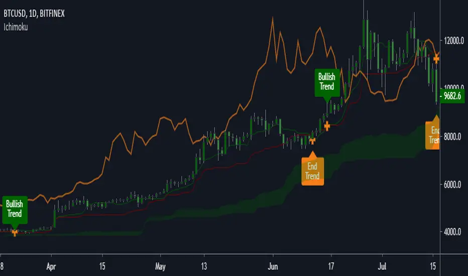 When the market is above the cloud, and Tenkan (green line) crosses over Kijun (red Line), there is a Bullish Trend . When Tenkan crosses under Kijun, the trend ends.