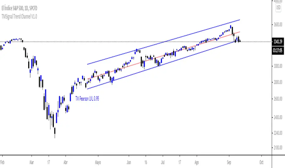 TMSignal Trend Channel V1.0: Automatically calculates bullish , bearish or lateral channels. %Pearson's R is added for better trend analysis.
