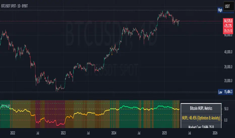 The Bitcoin NUPL (Net Unrealized Profit/Loss) Indicator is a powerful metric that shows the difference between Bitcoin's market cap and realized cap as a percentage of market cap. This indicator helps identify different market cycle phases, from capitulation to euphoria.