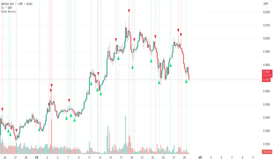 - Bearish Pinbar: Red downward triangle when upper shadow exceeds 2/3 of total candle length