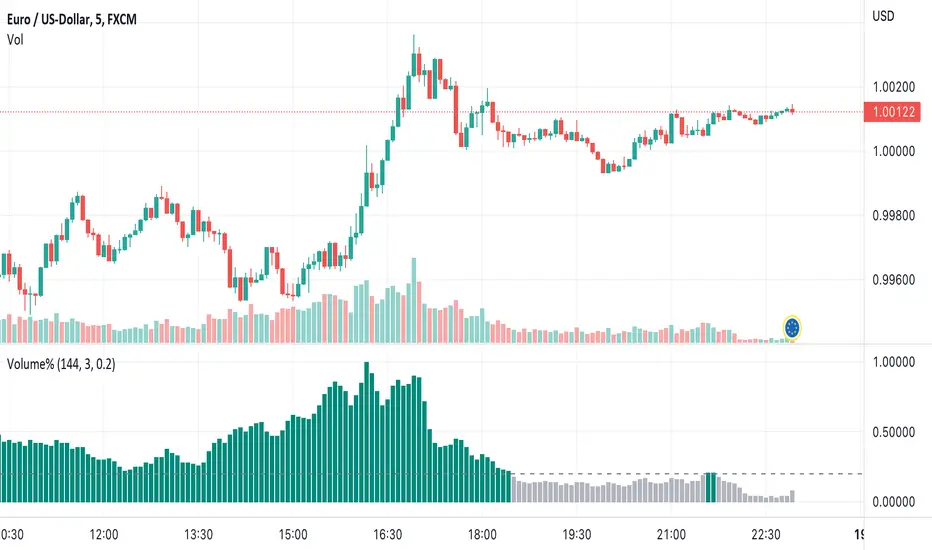 A simple indicator showing the relation of volume to highest volume for a define number of bars. Helps to differentiate periods of low and high volume.