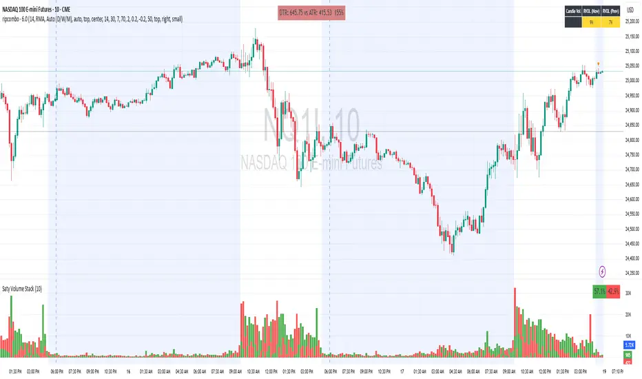 The indicator combines three major analytical tools into one TradingView Pine v6 script — designed for clean, at-a-glance insight into range, divergence, and volume activity.