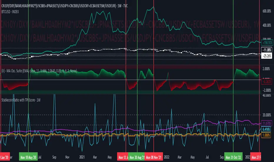 Plotted as a red line in the oscillator pane, showing the percentage of the market held in stablecoins.