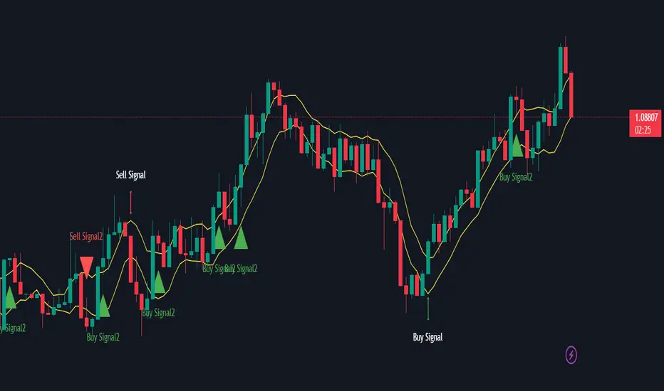 Scalping strategy that works on 5 min chart and aims to gain 10 pips. Do not act on every signal. Further investigation is required, for example by looking at RSI oversolf and overbought levels. For example, at an oversold area, a buy signal is more valid
