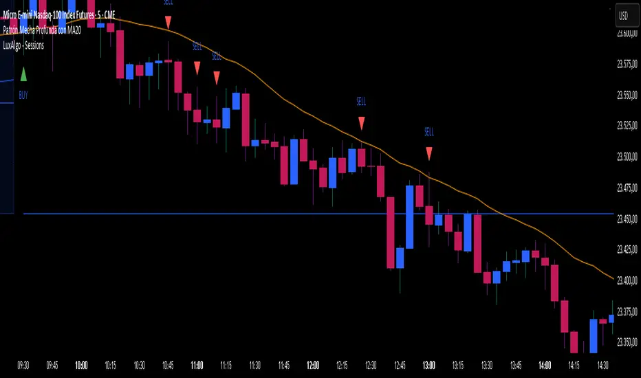 This indicator identifies a high-probability "Deep Wick Pattern" based on candlestick structure and volume analysis, filtered by the 20-period simple moving average (SMA). A buy signal is generated when the candle has a long lower wick, closes above the previous low, shows bullish structure, and is confirmed by increasing volume — all while the price is trading above the 20 SMA. A sell signal appears under the opposite conditions: a long upper wick, bearish candle closing below the previous high, with increased volume, and price trading below the 20 SMA. This tool helps traders spot potential reversals or continuations with added confirmation from trend direction and volume.