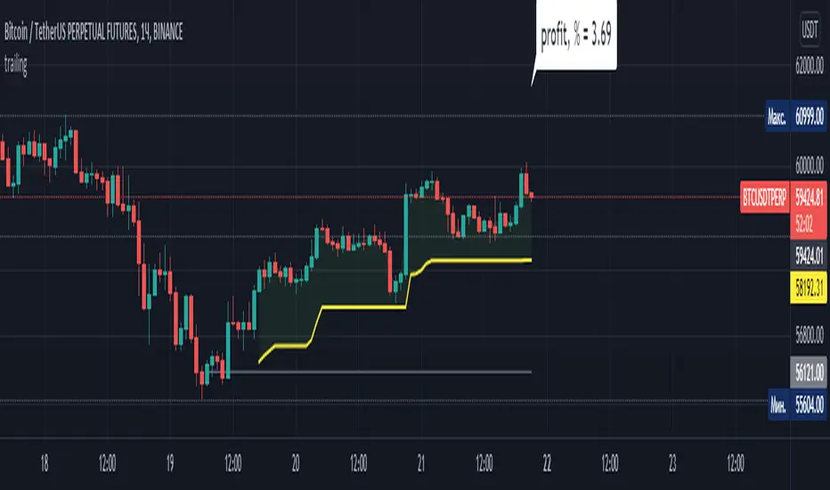 The trailing indicator. If ohlc4 becomes "Percent activate trail" above the entry price set by the value and entry date, then the trailing function is activated, which is considered as the maximum ohlc4 for the time in the position minus "Percent activate trail" multiplied by "koeff trail"