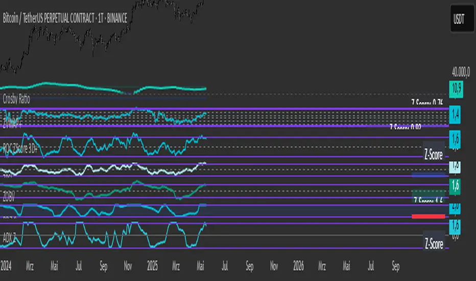 The ADX Z-Score Oscillator is a normalized version of the traditional Average Directional Index (ADX), designed to oscillate between fixed bounds for easier interpretation of trend strength. Instead of plotting the raw ADX line, this indicator calculates the Z-Score of the ADX relative to its recent average and standard deviation, allowing for consistent comparison over time and across different assets.