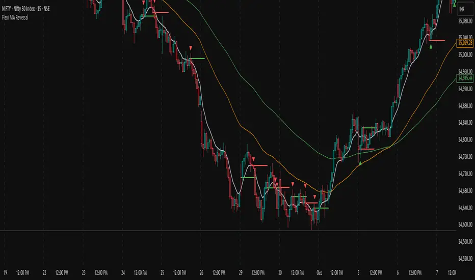 FlexiMA Reversal is a real-time, moving average-based reversal indicator designed to highlight potential market turning points using signal and alert lines. It provides visual cues for both early alerts and confirmed entry signals on candle close.