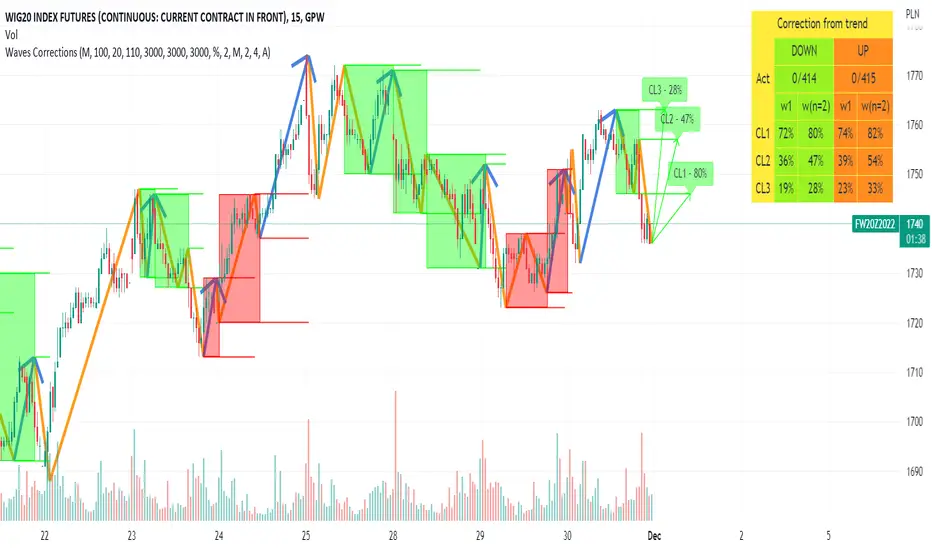 Wave theory tool for tracking waves relations and their corrections. It filters out a sets of formations and count how often correction from them are reaching characteristic correction levels marked on the chart as CL1, CL2, CL3.