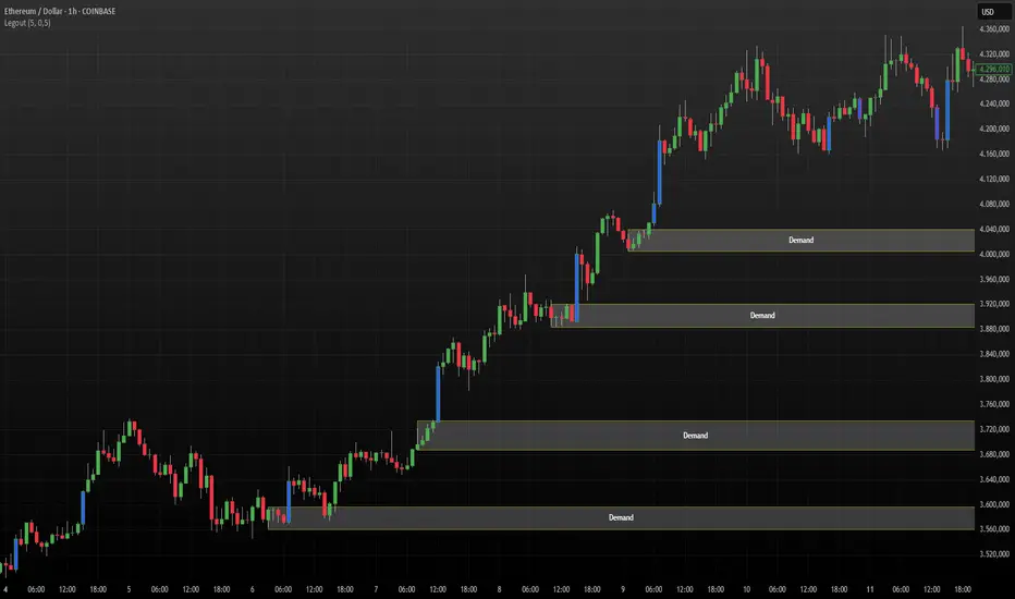 The Script marks candles that could be considered as a leg out of a supply/demand and are bigger than the previous ones based on the adjustable lookback value. There is also the option to adjust the threshold ob the body to wick ratio of the leg out candle. The lowest value is 50% because anything lower would be a basing candle.