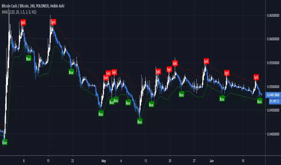 Here we have modified a keltner channel calculated using the Jurik Moving Average. This is a cleaner and longer term version of JMA Channels.