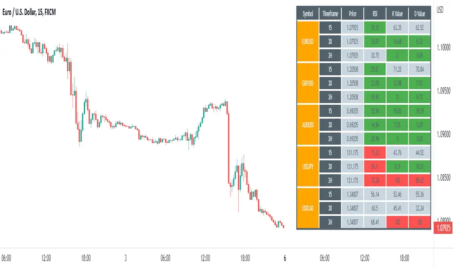 The updated version of the Multi Timeframe Stochastic RSI Screener allows traders to choose 5 symbols (optional) and 3 timeframes. Then it displays the associated calculations based on the timeframes chosen for each one of them. Also, the design of the screener improved a lot.開源腳本