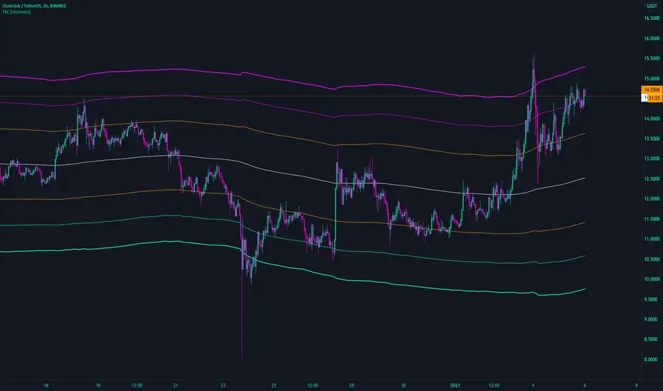 By default, the Keltner channels all have length of 500 and multipliers of 4, 7, and 10. Fills are available between each upper and lower EMA of the channel.