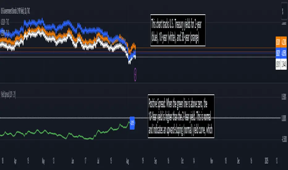 This chart tracks U.S. Treasury yields for 2-year (blue), 10-year (white), and 30-year (orange) bonds, along with the yield spread (green) between the 10-year and 2-year bonds. A positive spread suggests a normal yield curve and economic growth, while a negative spread (inversion) often signals a potential recession.