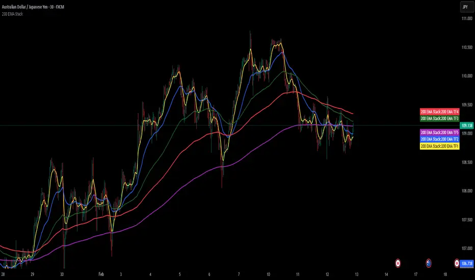 This indicator overlays five 200-period Exponential Moving Averages (EMAs), each calculated from independently user-selected timeframes. By aggregating higher and lower timeframe EMA data onto a single chart, it enables multi-timeframe trend analysis without requiring chart switching. This provides a consolidated view of structural trend alignment and dynamic support/resistance across time horizons, improving decision-making efficiency and contextual clarity.