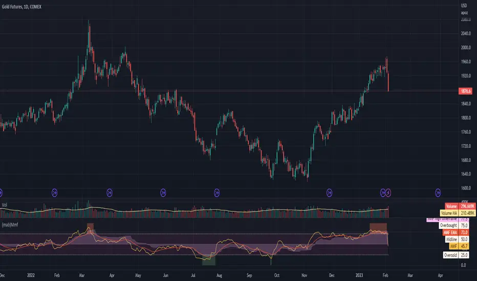 This indicator implements the (mab) Money Flow (MMF). The MMF is calculated using a formula inspired by RSI. In contrast to RSI, MMF uses the average of open, high, low and close as price source. This price is then multiplied with the volume as input for the RSI like formula to calculate the value.