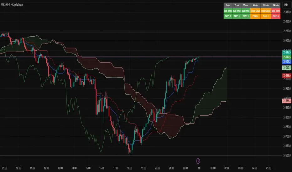 Quickly identify whether each timeframe is Bullish 🟢, Bearish 🔴, or Inside the Cloud 🟠, and align your trades with the dominant trend like a pro.