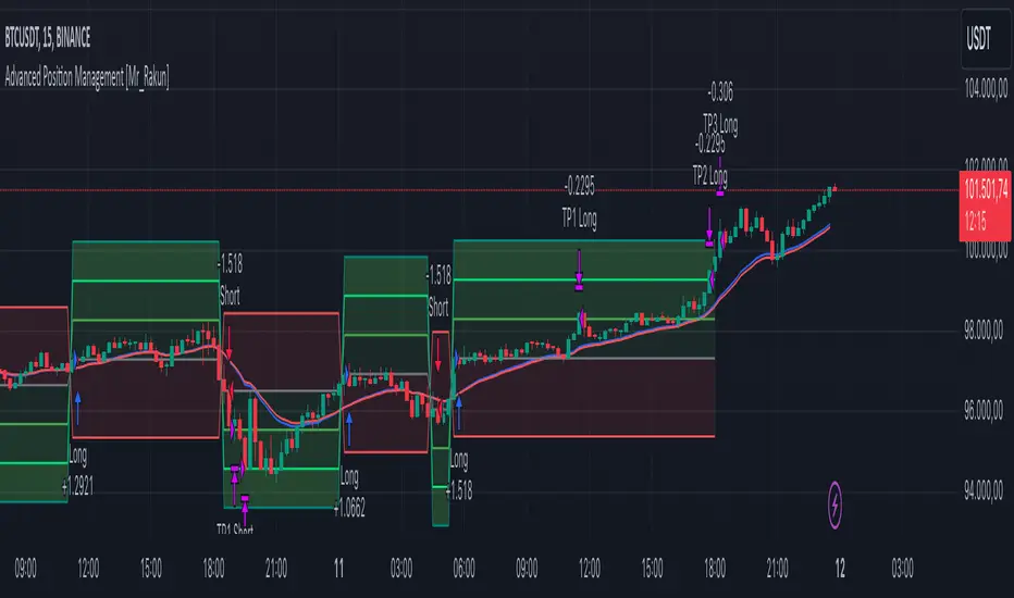 Bu Pine Script kodu, Gelişmiş Pozisyon Yönetimi için kendi stratejilerinize kolayca entegre edeceğiniz bir risk yönetimidir. Çoklu kâr al seviyeleri, takip eden stop-loss ve dinamik pozisyon büyüklüğü kullanarak işlem yürütme ve yönetiminde etkilidir.