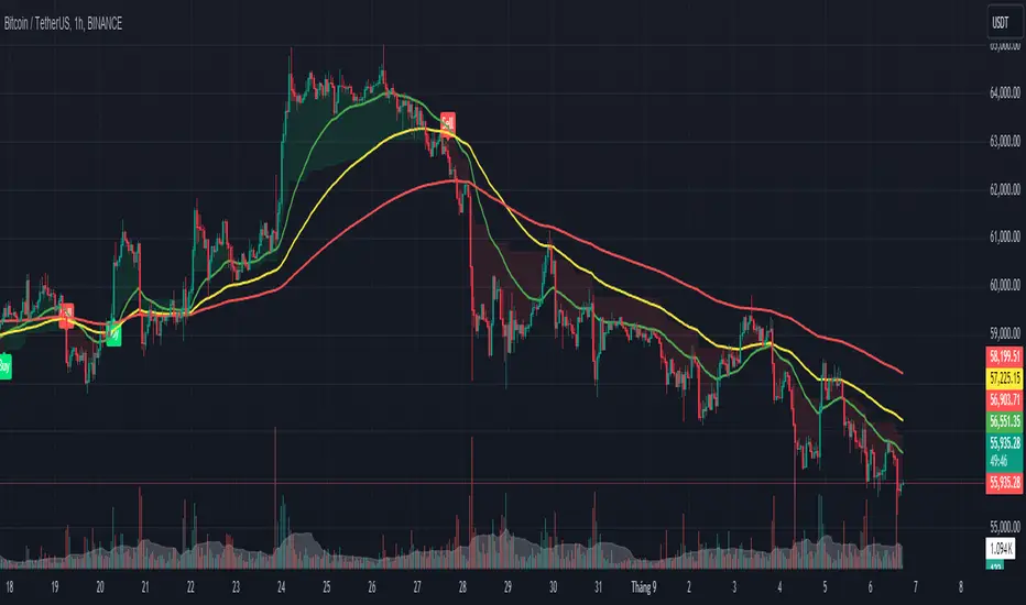 EMA (Exponential Moving Average) is a crucial tool in technical analysis, helping smooth price data and eliminate insignificant short-term fluctuations. This indicator uses three key EMAs: