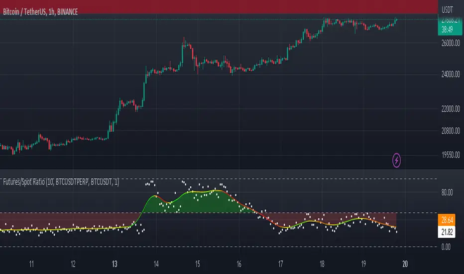 it compresses the ratio between two selected spot and futures trading pairs between 0 and 100. its purpose is to facilitate use and interpretation. it also passes a regression (Colorful Regression) through the middle of the data for the same purpose.