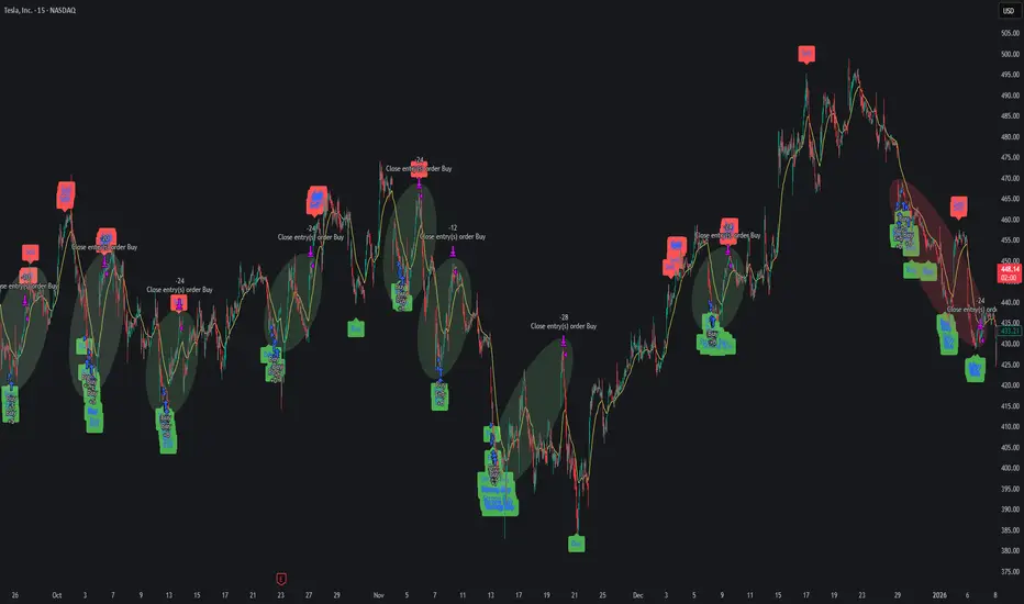 This strategy is designed for traders who want to capture high-probability reversals on the 15-minute chart for volatile/trending stocks. It combines multiple confirmation signals, controlled scaling, and risk management to deliver structured entries and exits. Includes webhook integration for automated execution and optional chart labels for transparency.