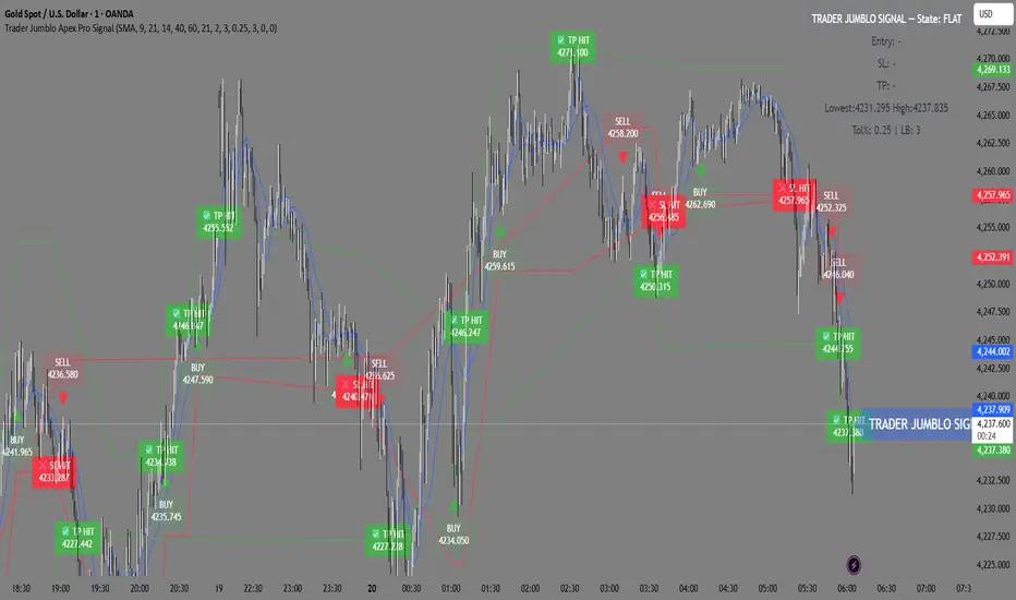 The Trader Jumblo Apex Signal Pro indicator is a precision-based market reversal tool designed to identify potential turning points in price with a strong confirmation logic.