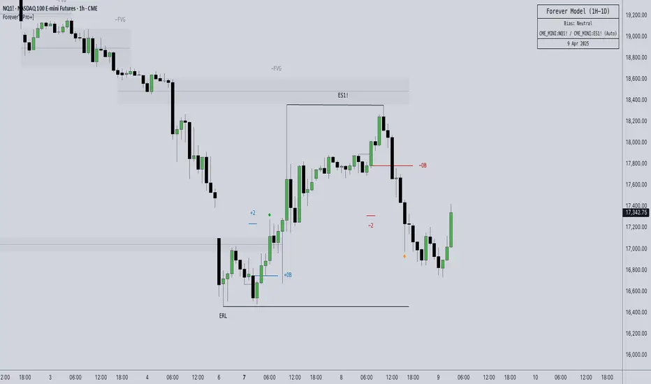 Forever Model [Pro+] (Sniper) is a clean, structured framework for visualizing internal liquidity to external liquidity rotations. It identifies shifts in market delivery by combining internal liquidity zones (Fair Value Gaps), divergence between correlated markets (Smart Money Technique), and lower timeframe orderflow changes (Orderblocks).