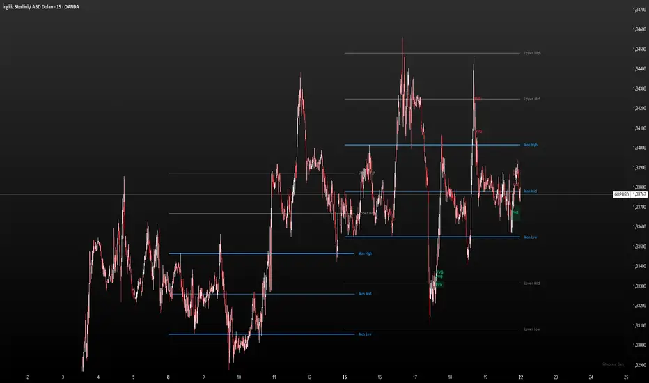 This indicator identifies the Monday Range (the price action from Monday's open at 00:00) and projects symmetric expansion levels across the entire trading week. It is designed for traders who use the weekly open and Monday's volatility as a benchmark for the week's price action.