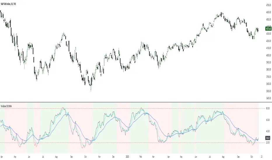 Displays the % of stocks above their 50 day average and the 5 and 20 ema of the indicator. Often the market will trend up when the 5ema is above the 20ema for this indicator, or down when vice versa. The 20% and 80% levels are plotted to show potentially oversold or overbought markets. Select NYSE or Nasdaq in the settings.
