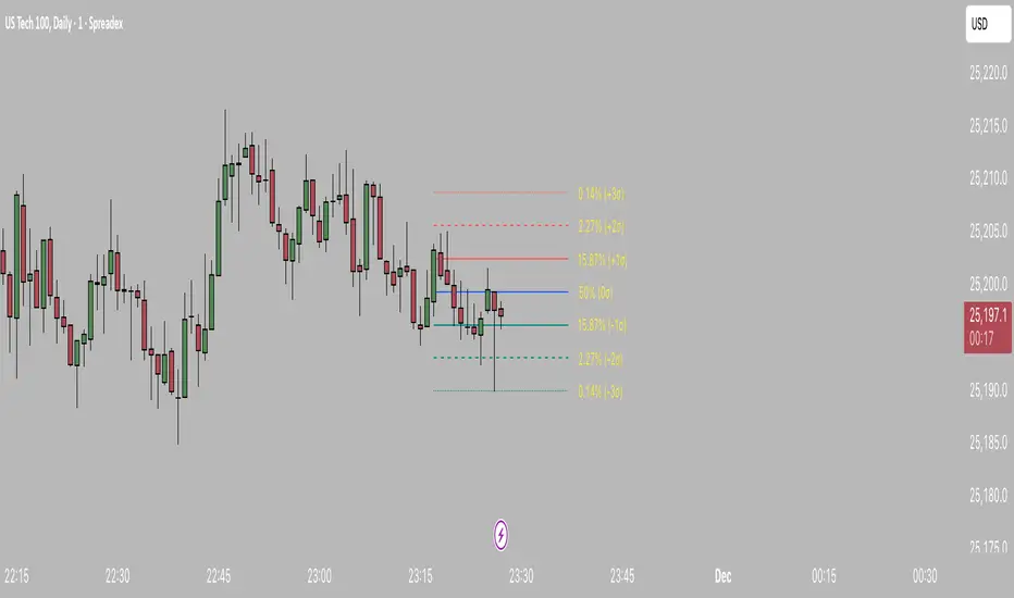 This indicator shows where the current price sits within a normal-distribution “sigma” framework and projects those levels as short, local reference lines rather than full trailing bands.