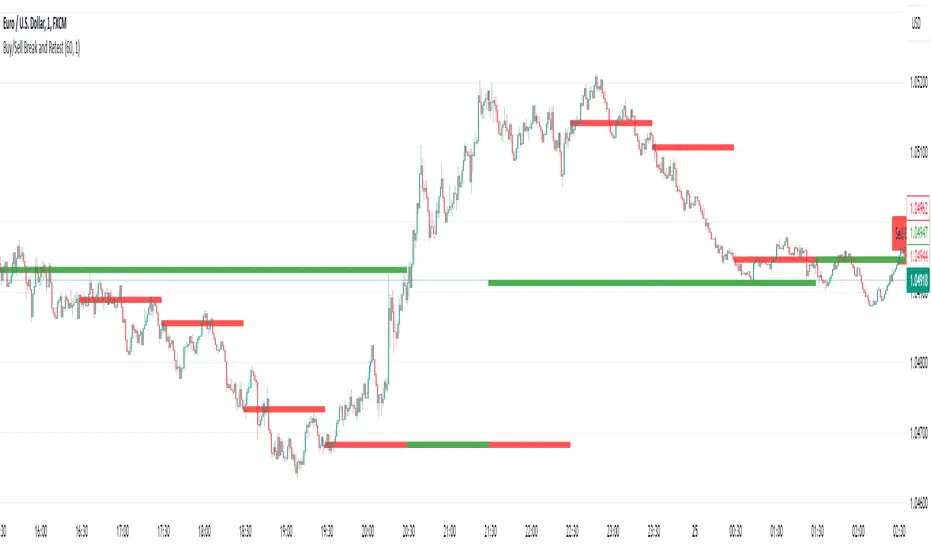 This script is a Pine Script indicator for TradingView titled **"Buy/Sell Break and Retest"**. Here's a description of its functionality: