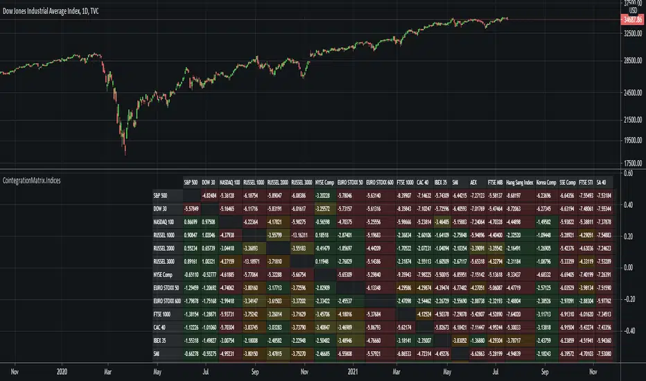 This indicator plots a cointegration matrix for pairings of most major stock indices. The matrix is populated with ADF t-stats (from an ADF-test with 1 lag). An ADF-test (Augmented Dickey-Fuller test) tests the null hypothesis that an AR process has a unit root. If rejected, the alternative hypothesis is usually that the AR process is either stationary or trend-stationary.
