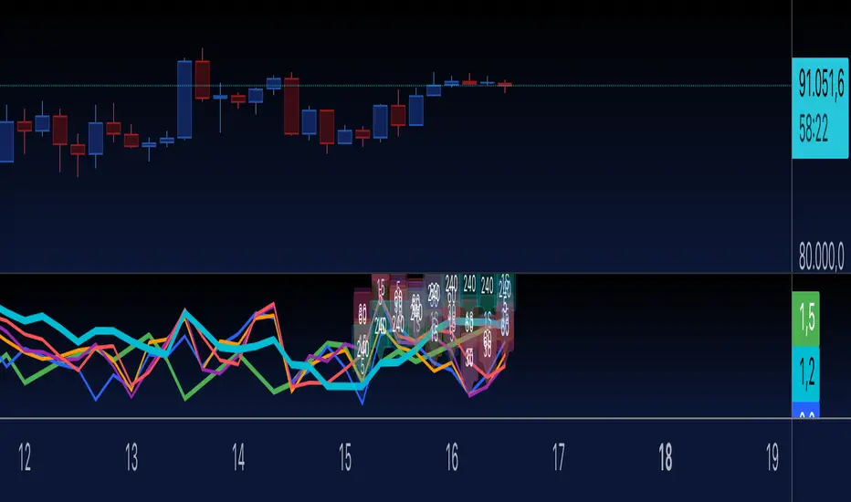 This Pine Script code calculates and plots Fisher Transform values for up to 6 different timeframes. The user can enable or disable each timeframe, and each Fisher Transform line is displayed in a unique color. Labels at the end of the lines indicate the timeframe.