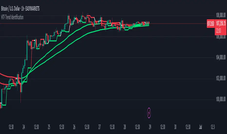 This indicator identifies higher timeframe (HTF) trends and plots them on the chart. It uses a fixed higher timeframe input and a selectable source to calculate the HTF value. The indicator also plots an EMA and colors the candles based on the HTF trend and EMA crossover.**Features:**