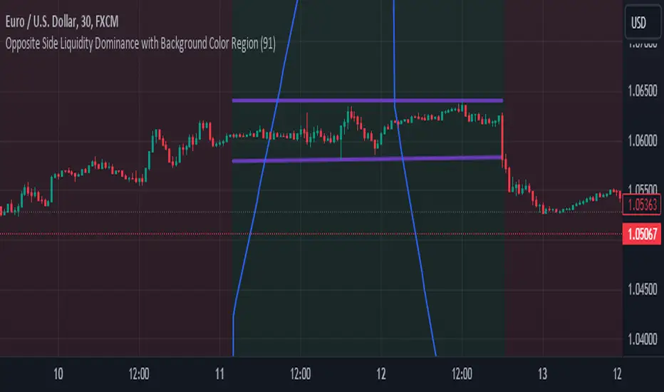 3. **Dominance Calculation**: We determine the "Opposite Side Liquidity Dominance" by comparing the current trading volume to the historical average. If the current volume is larger than what's typical, it suggests dominance, and we color the background of the chart green. If it's smaller, we color it red to indicate a lack of dominance.