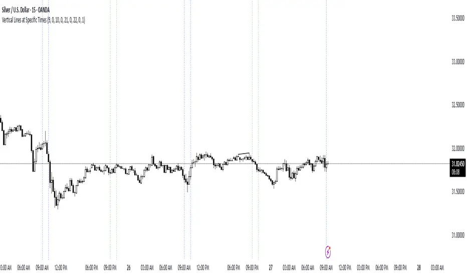 This **Pine Script v6** indicator for **TradingView** plots **vertical dotted lines** at user-specified times, marking key time ranges during the day. It is designed to help traders visually track market movements within specific timeframes.