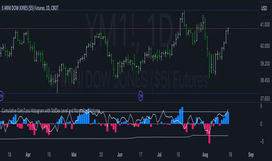 This TradingView Pine Script indicator combines several analytical tools to assist traders in making informed investment decisions. It calculates and visualizes cumulative gain/loss percentage, standard deviation levels, and normalizes trading volume on a reversed scale.