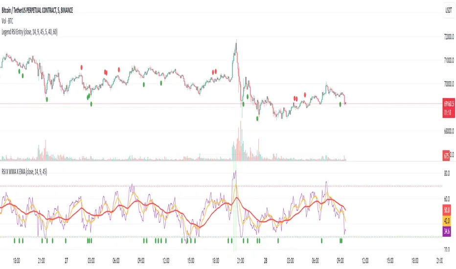 Special Conditions Based on WMA: The indicator enhances decision-making by including the WMA in its analysis. Buy signals (green dots) are only shown when the RSI is below the WMA, and sell signals (red dots) are displayed when the RSI is above the WMA. This additional condition helps in filtering out less probable trades.