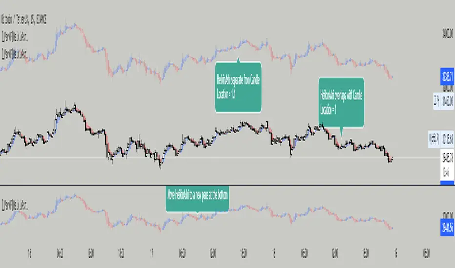 In the Input menu, the default value of Location is 1, and HeikinAshi can be seen overlapping the candle.