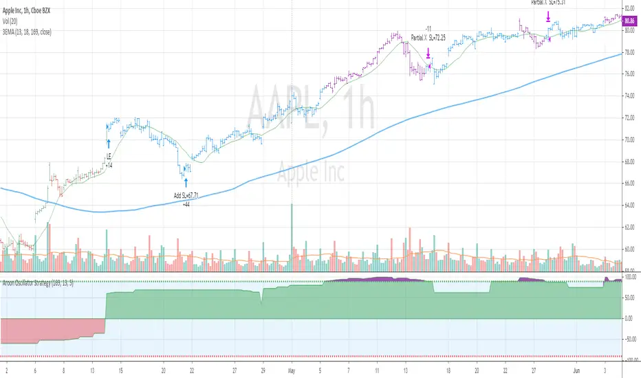 This is simple strategy based on Aroon Oscillator. I have found that using length 144 or 169 on hourly chart shows excellent results.