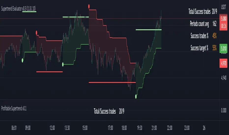 This a script to try detect the best combination of supertrend parameters in a space of time. Sadly the script is slow. Evaluate all possibilities params is hard for a pinescript and my knowledge too. In some cases, when you want evaluate many time could be the script fails for timeout. Perhaps with time I could enhance. For this problem of speed the calculate of combinatios it's not complete: In factor use a increment of 0.2 in each param (0.1, 0.3, 0.5 ...) in period the increment for each value is 3. The range for factor it's from 3.0 to 12.0. The range of period it's from 10 to 43