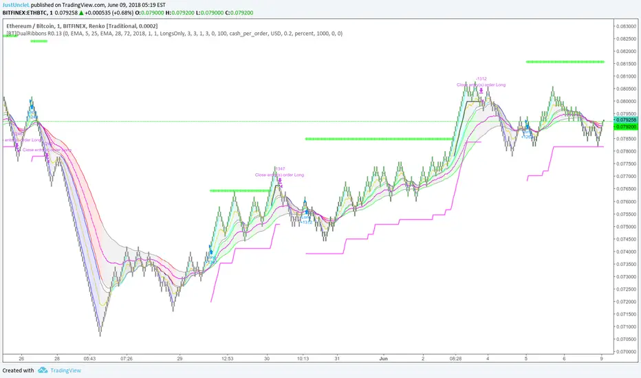 This is an implementation of a strategy based on two MA Ribbons, a Fast Ribbon and a Slow Ribbon. This strategy can be used on Normal candlestick charts or Renko charts (if you are familiar with them).