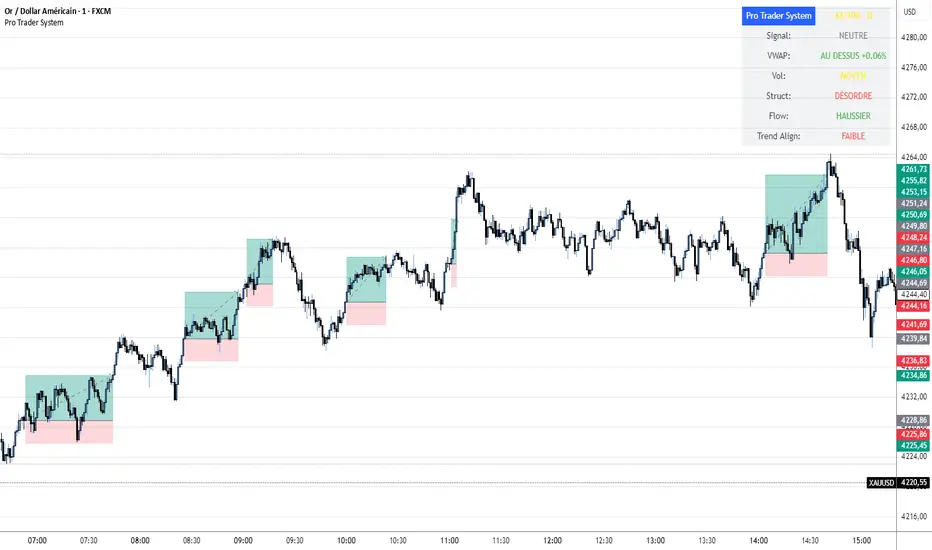 Pro Trader System is a comprehensive trading indicator that combines multiple technical analysis tools into one powerful system. It provides clear BUY/SELL signals with a proprietary scoring system (0-100) to help traders make informed decisions across all timeframes and markets.