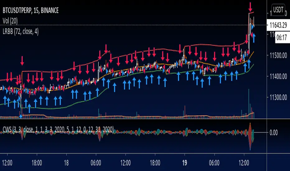 Linear Regression Band implements a BB like structure but with the middle line using solely a linear regression as input. In addition unlike bollinger bands , the market price never wicks out of the linear regression band. This is because it gives the absolute possible range taken from the middle line.