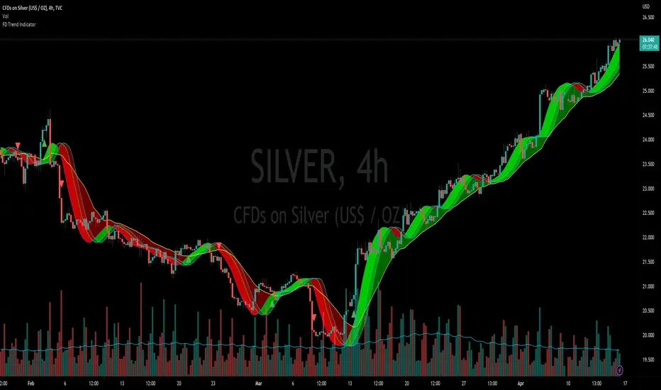 Flying Dragon Trend plots the trend bands into the ribbon, where the colours indicate the trend of each band. The plotting of the bands can be turned off in the input settings. Based on the user selectable Risk Level the trend pivot indicator is shown for the possible trend pivot when the price crosses the certain moving average line, or at the Lowest risk level all the bands have the same colour. The trend pivot indicator is not shown on the Lowest risk level, but the colour of the trend bands is the indicator instead .