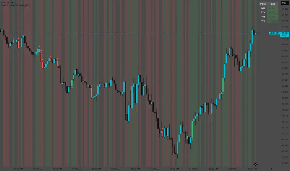 The Risk-On / Risk-Off Toolkit [SB1] is a professional-grade market context indicator designed to help traders quickly identify broad market sentiment shifts and gauge risk appetite. By combining major US equity futures (NQ, RTY, YM) with VIX dynamics, this toolkit provides clear visual signals of “Risk-On” (bullish, lower volatility environment) and “Risk-Off” (bearish, higher volatility environment) conditions. This is ideal for traders using discretionary analysis, swing strategies, intraday scalping, or portfolio positioning decisions.