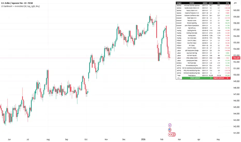 US Sentiment — invincible3 is a macro dashboard table that tracks key U.S. economic indicators (FRED + TradingView ECONOMICS series) and converts their latest changes into a simple bullish / bearish / neutral sentiment signal. It helps traders quickly understand whether the macro backdrop is improving or deteriorating — without switching between multiple charts.