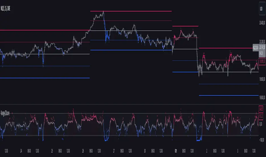 The "Trading Ranges + ZScore" script is a versatile technical indicator developed for TradingView. This tool combines two powerful concepts—price ranges and Z-Score analysis—to help traders identify potential trend reversals, overbought/oversold conditions, and trend strength. The script dynamically calculates price ranges based on recent price action and utilizes Z-Score to detect deviations from a statistical norm, providing valuable insights for decision-making in both ranging and trending markets.