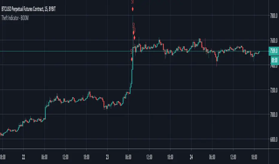 Theft Indicator - BOOM is a script that shows entry levels on a condition that is met with our special algo. The algo consists of crossovers, which are not visible but we take pride in the effort we have put to make this indicator have a high success rate as long as you have a scalping target price set.